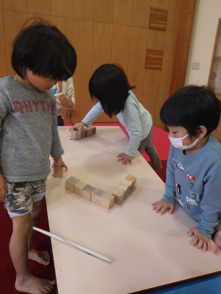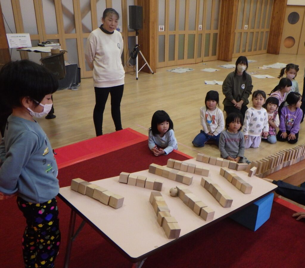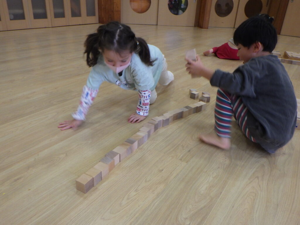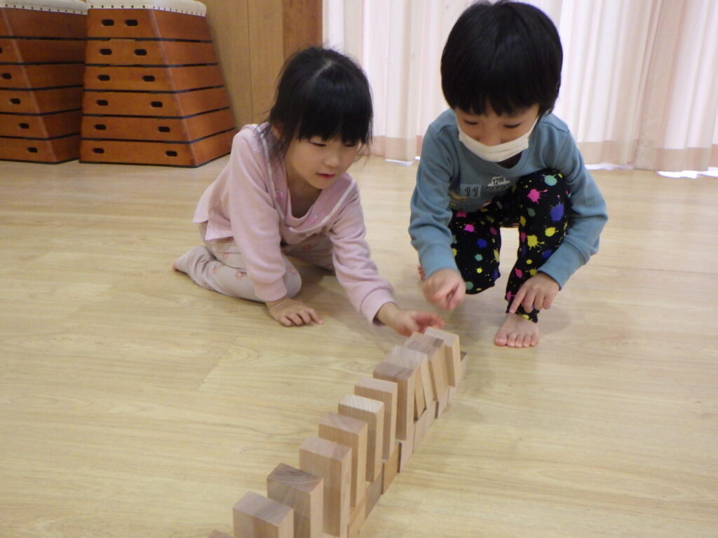 まずは『ドミノ倒し競争!』四角い積み木を真っすぐ並べて電車を作ったら・・・