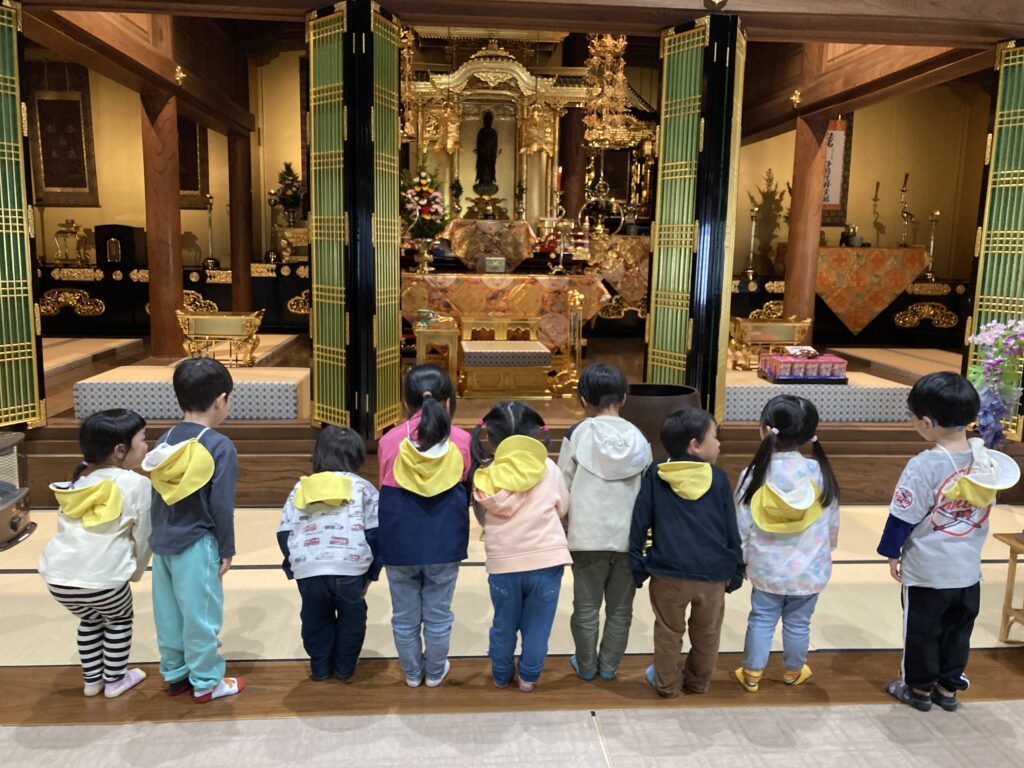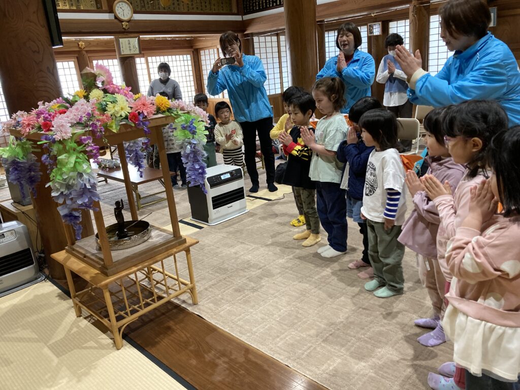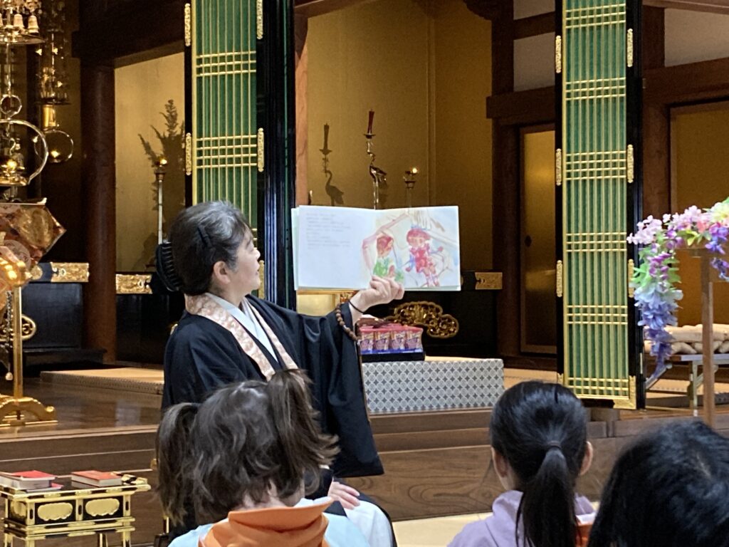 絵本で花祭りはお釈迦様の誕生日をお祝いすることを教えてもらったよ