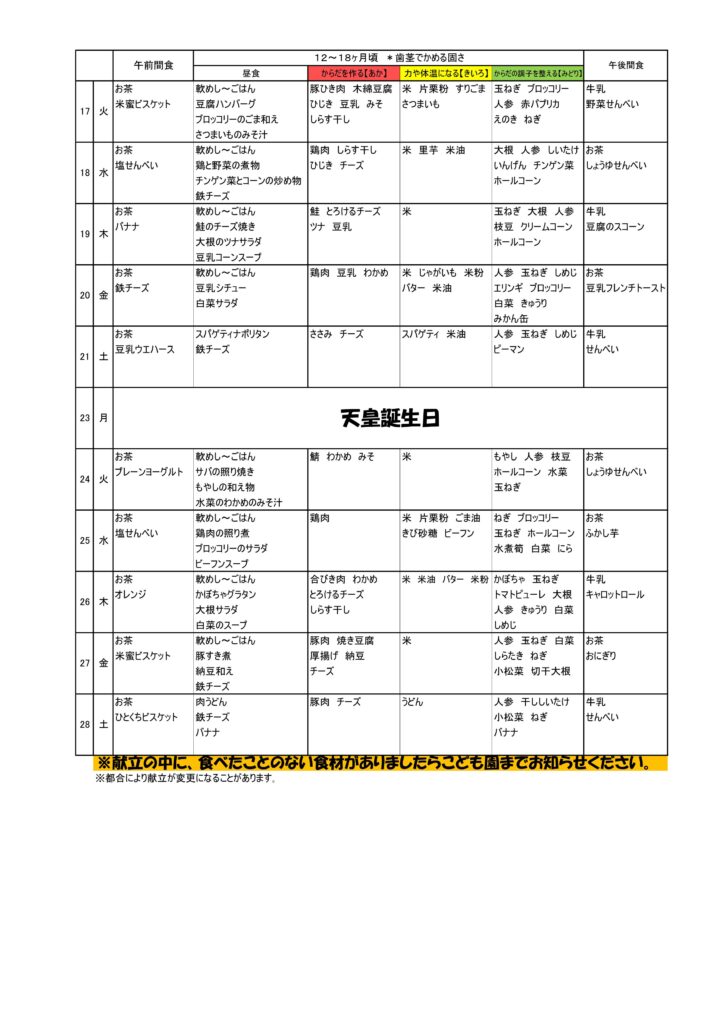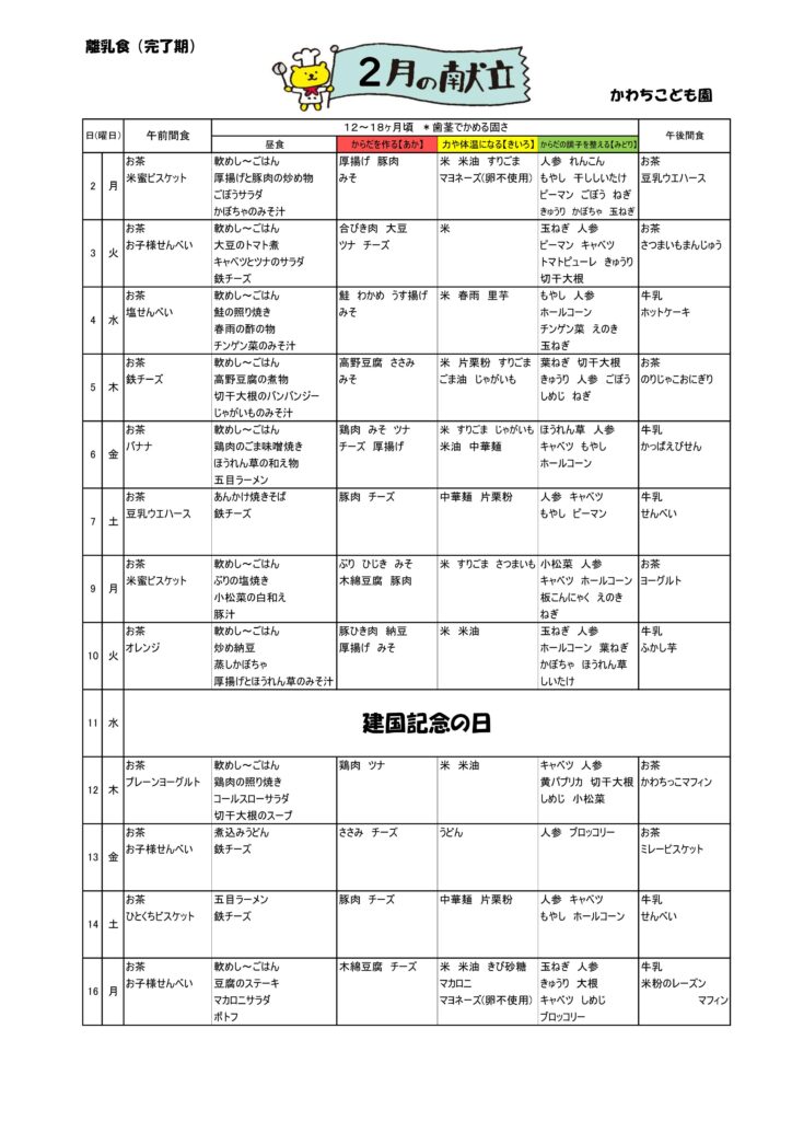 • 令和8年2月 離乳食予定献立表(完了期)